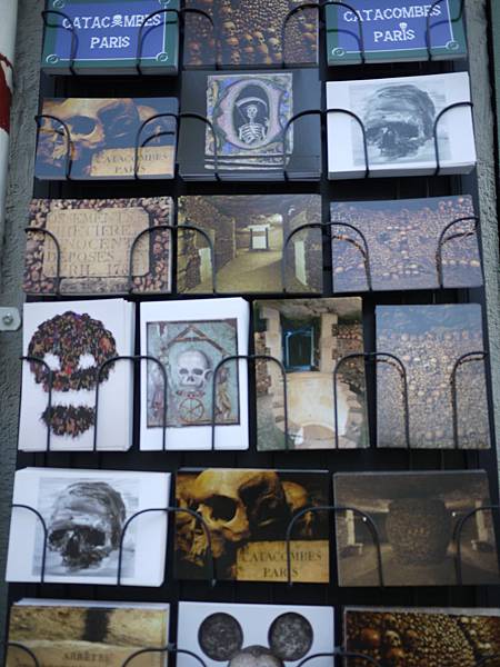 巴黎的萬人塚以前是個採石場,18世紀末逐一接收各個公墓送來的無名骸骨,隨著城市現代化,許多建設往地上開挖,陸續起出更多的骨頭,全部都被安置在這裡,法國人做什麼事都要講究美感,骨頭也排成各種美觀的形狀,所以也減少了死人所帶來的驚駭感。但是參觀完畢來到出口,看到桌子上隨意放著幾根骨頭也未免太嚇人了吧!我猜這些骨頭可能是偷竊未遂的傑作,既然有人喜歡和骷頭照相,一定也有喜歡收藏骸骨的怪人吧!