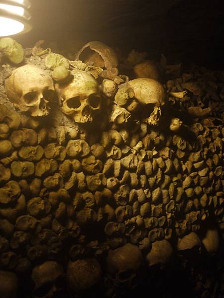 很久以前曾經參觀過倫敦的西敏寺,在數量龐大的墓碑群裡走到腳軟,嚇到差點屁滾尿流,來了西班牙以後開始習慣在教堂看到墳墓,而且這裡的墳墓都是一格一格的棺材形狀的水泥牆,最讓我驚慌的一次莫過於西班牙Escorial的皇家墓室,但這樣一次又一次不斷的訓練,這次來到巴黎我竟然可以泰然自若的參觀萬人塚,在長達幾公里的地道裡,小徑的兩旁是成堆古老的骷髏頭和骨頭,整整齊齊的排列像個柴堆一樣。把人骨排成像柴堆供人參觀,這大概只有法國人才會想出這種賺錢把戯。