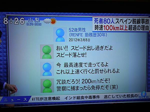 終於在3天後連上宅男L,他說7月開始西班牙進入渡假季節,機票旅館都漲價,他那裡也不想去,只會待在馬德里。換句話說,口袋比較淺的人發生意外的機率,應該是比有錢人還小一點。日本電視針對這次的火車事件,做了深入的實況動畫模擬和專題報導,他們分析火車事件發生的各種可能性,連同司機本人個性行為也列入分析議題當中。